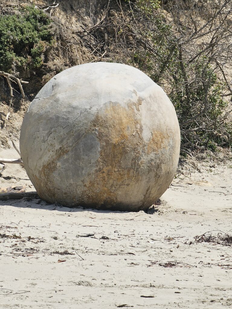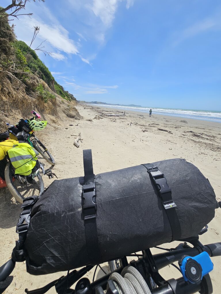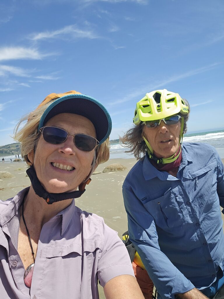 We decided to try taking the bikes onto the beach. The sand was hard and it was a lovely feeling sailing along silently (no crunching of gravel or roaring traffic) with the sea alongside and then the big round rocks appeared!